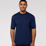 A4 ADT SOFTEK RINGR T. 65% Recycled Poly, 35% Natural Cotton. 4.1 ounces. Moisture wicking to keep athletes cool. Stain and odor release for easy care. Earth friendly. Contrast ribbed collar and cuffs. Easy tear away label for rebranding.